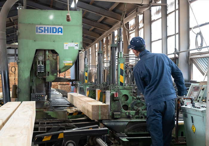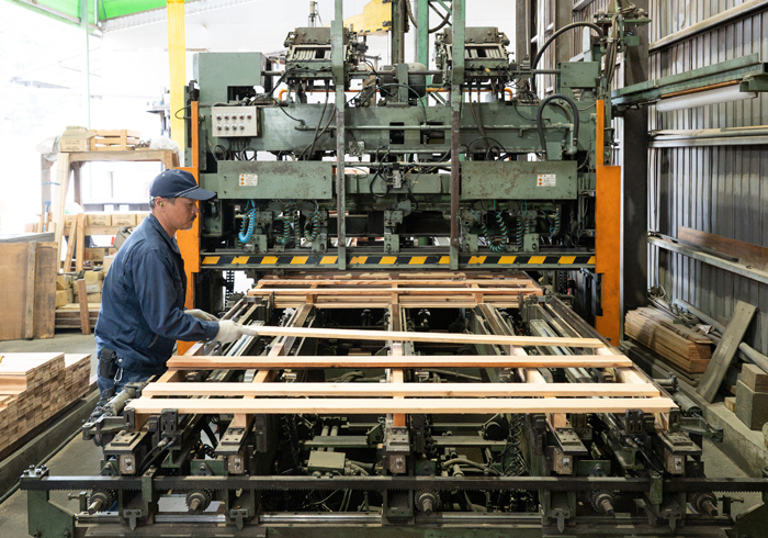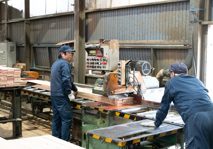 受注をいただいたら、用途に応じて原木を選定し、ユーザーニーズに併せて製材します。製材した部材を組み立ててパレットを作成しています。